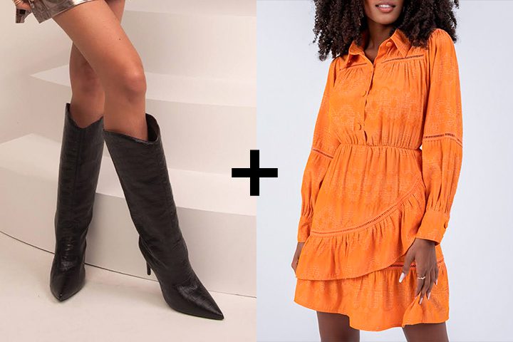 Combinar botas de cano alto com vestidos fluidos é um dos looks mais clássicos e elegantes desta lista. Combine botas de cano alto com um vestido curto ou midi para criar um visual feminino e sofisticado. Escolha uma cor neutra para as botas, como preto ou marrom, para que elas combinem com qualquer vestido, inclusive os coloridos.
